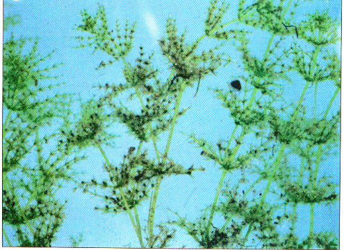 Chara features a leaf-like structure around a hollow stem and grows densely while remaining unattached to the bottom. Mineral deposits on its surface can give it a gritty texture, and it emits a strong musky odor when crushed