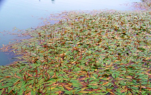 American Pondweed is a perennial aquatic plant characterized by its alternating floating and submerged leaves. The floating leaves are elliptical to oval in shape, ranging from 4 to 7 inches in length and up to 1 inch in width, and are attached to long petioles. The submerged leaves are less abundant, blade-like, somewhat transparent, and smaller than the floating leaves.